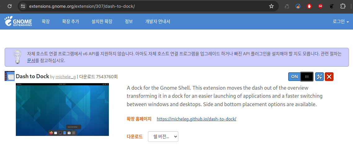 https://extensions.gnome.org/ 에 접속해서 확장프로그램을 설치하면 됩니다.