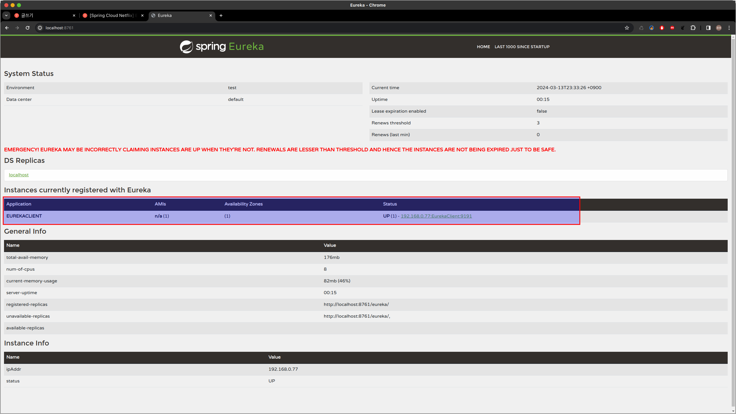 Eureka Server에 접속된 Client의 목록 보여집니다.
