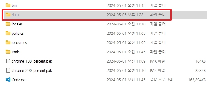 - data 폴더에 extensions 폴더와 user-data 폴더가 생성된 것을 확인할 수 있습니다.