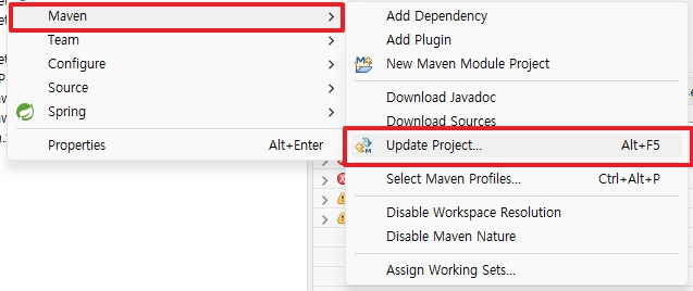 2. 프로젝트 > 우클릭 >> Maven >> Update Project