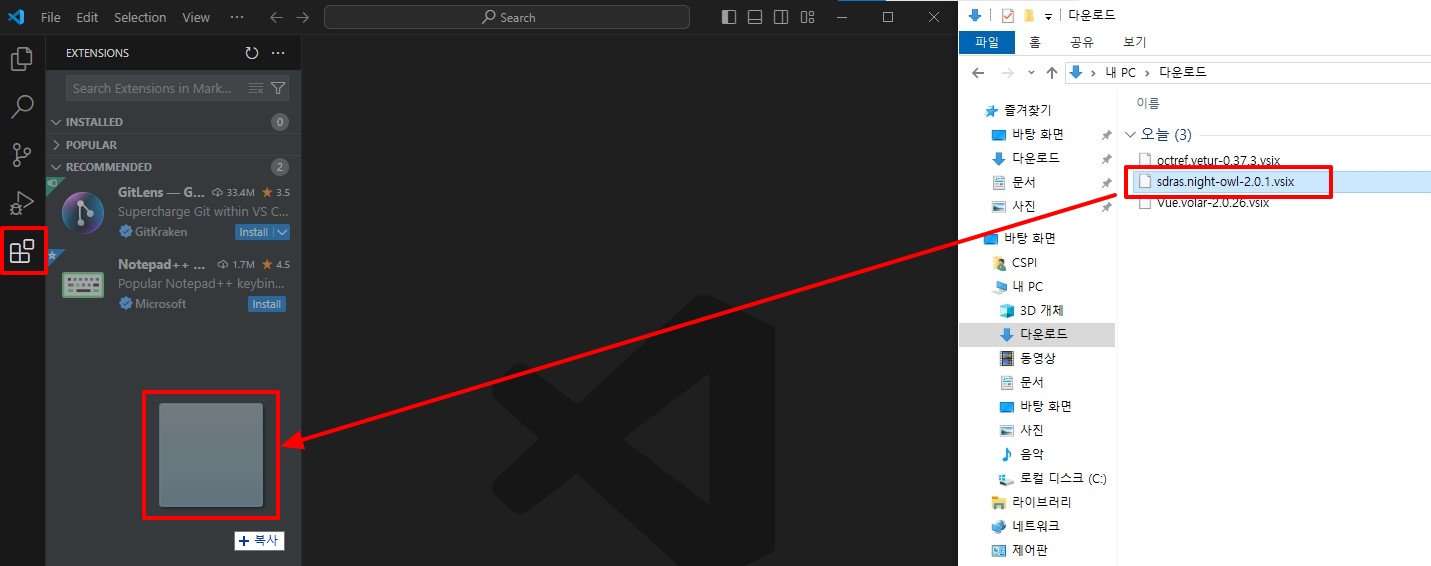 마. 설치 #2 ( 확장을 선택하시고, .vsix 파일 을 끌어다 놓으면 됩니다. )