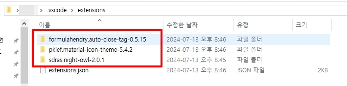 3. 확장 프로그램이 설치된 장소 ( 일반적으로 c:/User/{사용자}/.vscode/extensions 폴더에 설치됩니다. )
