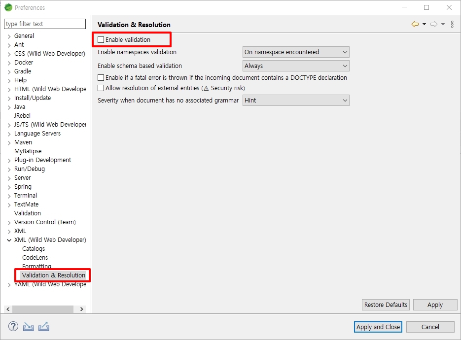 [ Window >> Preference >> XML (Wild Web Developer) >> Validation & Resolution ] Enable validation 의 체크를 해제 해주면 됩니다.