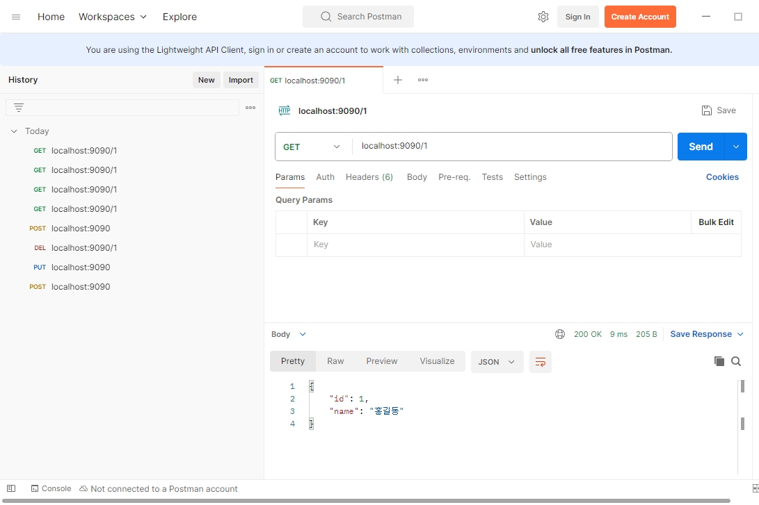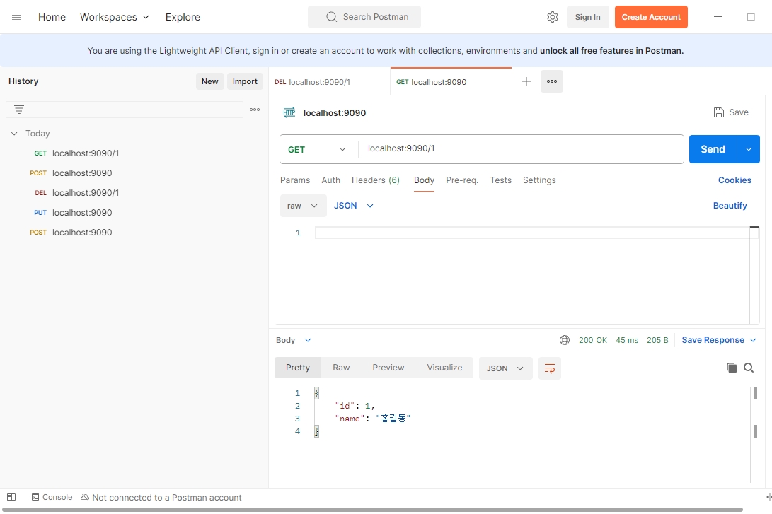 1. 저장 : POST, localhost:9090, Body > raw > JSON