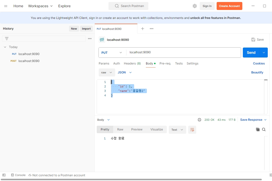 2. 수정 : PUT, localhost:9090, Body > raw > JSON