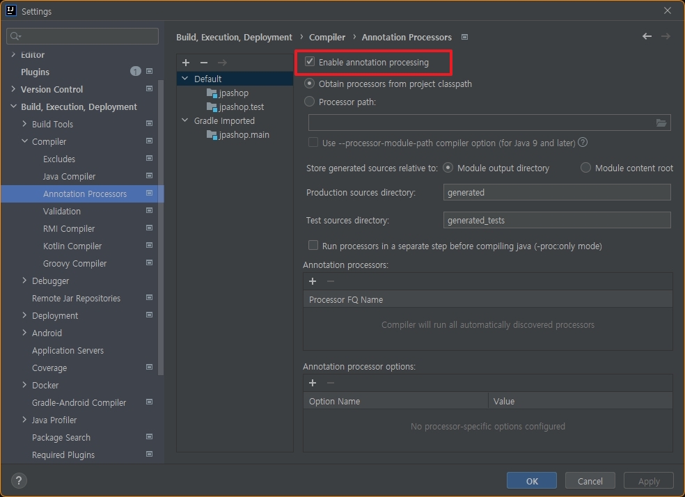 [File] > [Settings] > [Build, Execution, Deployment] > [Compiler] > [Annotation Processors] > Enable annotation processing